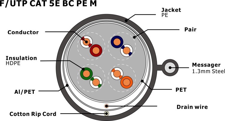 | Schild: | FTP, abgeschirmtes verdrehtes Paar | Produktname: | F/UTP CAT5E PE mit Messenger |